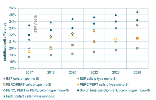 圖四:ITRPV-2018各種電池的產(chǎn)轉(zhuǎn)換效率圖