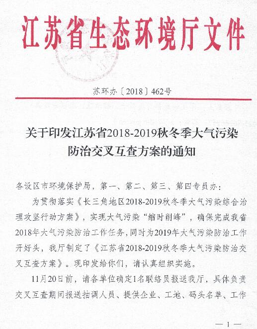 關(guān)于印發(fā)江蘇省2018-2019秋冬季大氣污染防治交叉互查方案的通知