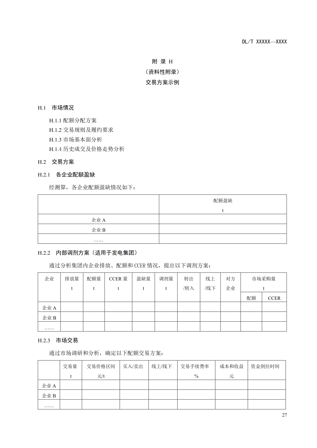 6.5.2.3.4 交易方案在企業(yè)配額盈缺測算和市場分析基礎(chǔ)上編寫,主要內(nèi)容包括交易方向(買入、賣出)、交易方式(線上交易、線下交易)、交易模式(現(xiàn)貨交易、衍生品交易等)、交易標(biāo)的物(配額、CCER等)、交易價格、交易量、所需資金量及資金到位時間、交易成本收益等,對于集中管理的發(fā)電集團還應(yīng)包含內(nèi)部調(diào)劑相關(guān)內(nèi)容,交易方案示例參見附錄H。
