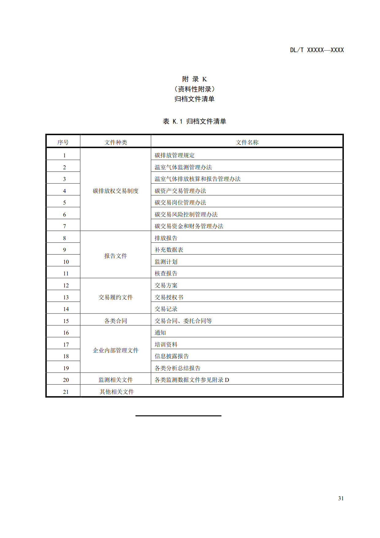 6.10.1 發(fā)電企業(yè)應(yīng)妥善保管碳交易相關(guān)文件,建立歸檔文件清單和文件庫,歸檔文件清單參見附錄K,歸檔文件應(yīng)至少保存10年。