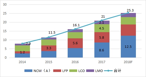 圖表 3  2014-2018年中國不同類型正極材料產(chǎn)量及預(yù)測(萬噸)