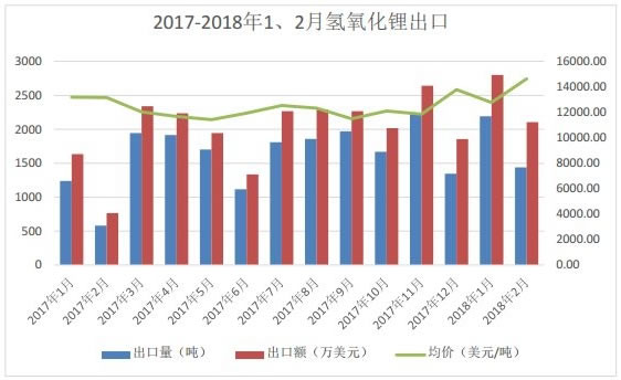 2018年2月中國氫氧化鋰出口量為1439.215噸,同比增加147.38%,環(huán)比減少34.33%,離岸均價14624.98美元/噸,同比上升11.14%,環(huán)比上升14.5%。1-2月份氫氧化鋰出口合計3630.79噸,同比大幅增長99.26%。1月份出口量的環(huán)比大幅回升,主要是由日韓地區(qū)出口量恢復帶動。2月份有所下降主要由于春節(jié)停產(chǎn)導致。