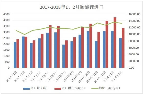 2018年2月中國碳酸鋰進口2517.09噸,同比減少4.36%,環(huán)比減少19.16%,離岸進口均價13283.27美元/噸,環(huán)比下降3%,同比上升34%。2月傳統(tǒng)春節(jié),部分下游廠商停止采購,導致碳酸鋰進口有所下降。