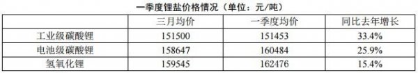 2018年一季度電池級碳酸鋰均價同增25.9%