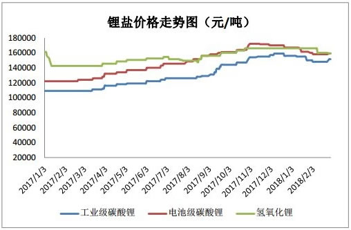 2018年一季度鋰價呈高位運行。農(nóng)歷春節(jié)前,由于下游電池企業(yè)去庫存,導致需求偏弱,鋰價呈下滑趨勢。而節(jié)后大部分下游廠商由于年前未儲備夠