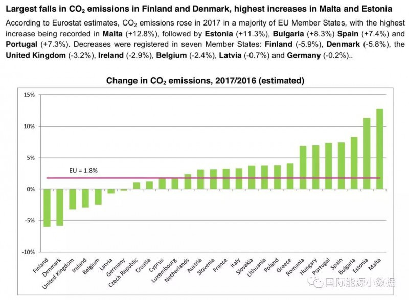 根據(jù)Eurostat剛剛發(fā)布的數(shù)據(jù),2017年歐盟國(guó)家能源相關(guān)的碳排放比2016年增長(zhǎng)1.8%。歐盟國(guó)家中排放增長(zhǎng)幅度比較大的國(guó)家有:馬耳他(+12.8%)、愛(ài)沙尼亞(+11.3%)、保加利亞(+8.3%)、西班牙(+7.4%)、葡萄牙(+7.3%);排放減少的國(guó)家有:芬蘭(-5.9%)、丹麥(-5.8%)、英國(guó)(-3.2%)、愛(ài)爾蘭(-2.9%)、比利時(shí)(-2.4%)、拉脫維亞(-0.7%)、德國(guó)(-0.2%)。