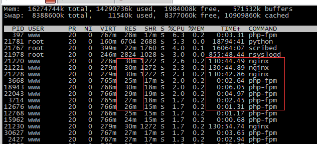 這也是我們線上服務(wù)器的配置,我們線上用的web服務(wù)的機(jī)器是12cpu、12G內(nèi)存,nginx開啟12worker進(jìn)程,php開啟256個進(jìn)程,跑起來后每個進(jìn)程大概占用30M內(nèi)存,也就是(256+12*30=8G ,另外還跑了一些配管、監(jiān)控、統(tǒng)計(jì)、日志收集等七七八八的軟件,整體業(yè)務(wù)是比較輕松的,這種靜態(tài)池的配置大大減少了prefork進(jìn)程帶來的開銷,RT時間100ms以內(nèi)的占到90%以上(這個與程序?qū)懙娜绾斡嘘P(guān)),運(yùn)行一段時間后的開銷截圖如下: