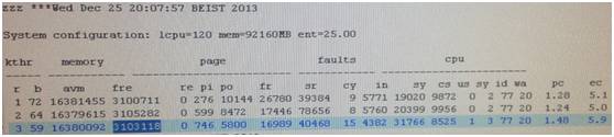 由于nmon采樣的顆粒度比較粗,而oswatcher監(jiān)控的采樣間隔是20秒,因此分析oswatcher的數(shù)據(jù),主要分析vmstat的輸出,從vmstat的輸出可以看到當(dāng)時(shí)free還有3103118個(gè)內(nèi)存頁(yè)面(每個(gè)頁(yè)面4KB),即12GB內(nèi)存,而此時(shí)有746個(gè)pi和16989個(gè)po。因此可見(jiàn)在內(nèi)存有剩余的情況下產(chǎn)生了換頁(yè)。