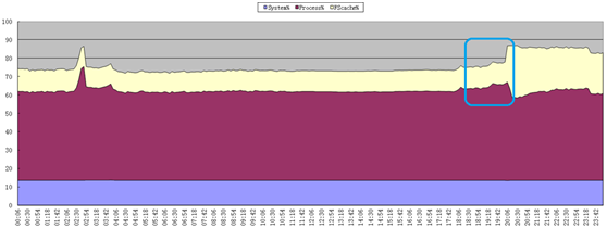 分析內(nèi)存的數(shù)據(jù)可知全天內(nèi)存使用率并不高,基本穩(wěn)定在80%以?xún)?nèi),在20:06之前的一段時(shí)間,有計(jì)算內(nèi)存增長(zhǎng)情況,這和當(dāng)時(shí)處理的業(yè)務(wù)相關(guān)。(注:nmon采樣點(diǎn)是6分鐘采一個(gè)點(diǎn)并取平均值)