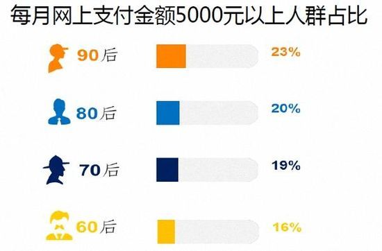 調(diào)查顯示,70后、80后為消費(fèi)主力軍,其中70后中的高收入人群比例最高,51%的70后每月可支配收入在5000元以上。90后的收入雖然比其他年齡段少,但每月網(wǎng)上消費(fèi)金額在5000元以上的比例是最高的(23%)。