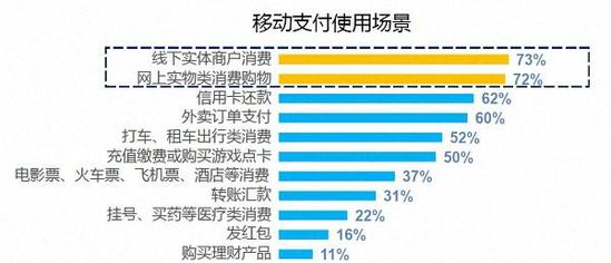 在移動(dòng)支付的使用場(chǎng)景中,商超及餐飲類(lèi)線下實(shí)體消費(fèi)、網(wǎng)上實(shí)物類(lèi)消費(fèi)比例最高。