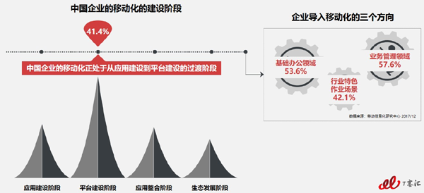 國內(nèi)企業(yè)的移動化建設(shè)正處在從應(yīng)用向平臺階段過渡,其中處于該階段建設(shè)的企業(yè)已達(dá)41.4%。另外,企業(yè)導(dǎo)入移動化主要從三個方向著手:業(yè)務(wù)管理領(lǐng)域(57.6%),基礎(chǔ)辦公領(lǐng)域(53.6%)以及行業(yè)特色作業(yè)場景(42.1%)。