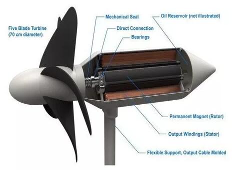 渦輪機(jī)本身設(shè)計成能承受極端海浪和惡劣天氣(比如臺風(fēng)),就像一朵花,直徑為70公分的5條旋轉(zhuǎn)葉片由柔軟材料制成,旋轉(zhuǎn)速度慢到足夠讓不小心被葉片掃過的海洋生物逃脫不受傷,支架結(jié)構(gòu)也靈活彎曲,以避免它們在大浪之下“剛極必折”。研究團(tuán)隊估計,渦輪機(jī)的使用壽命長達(dá)10年。