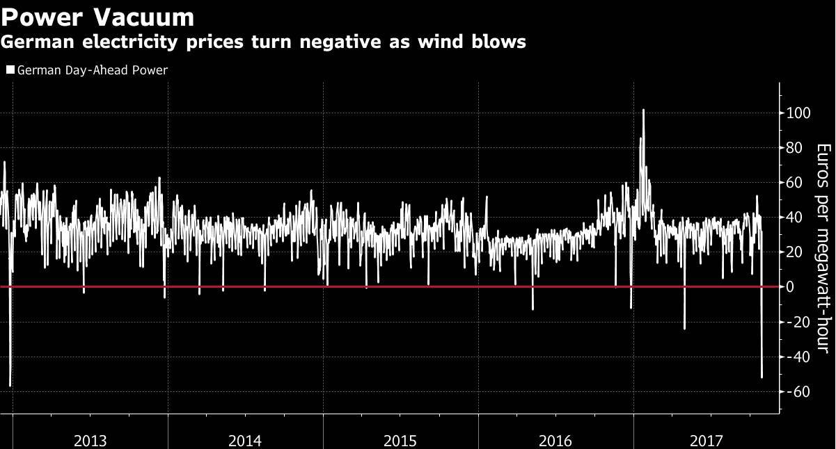 能夠把多余的風(fēng)能儲(chǔ)存起來對(duì)的德國來說十分重要。要知道,多風(fēng)的德國由于風(fēng)力發(fā)電量過剩,經(jīng)常出現(xiàn)電費(fèi)為負(fù)的情況。就在 10 月 29 日的那個(gè)周末,由于大風(fēng)天氣,德國的總風(fēng)力發(fā)電量達(dá)到了 39409 兆瓦,相當(dāng)于 40 個(gè)核反應(yīng)堆。德國電網(wǎng)為了平衡供需關(guān)系,把多余的電量消耗掉以免損壞電網(wǎng),無奈只能將電費(fèi)變負(fù)。負(fù)的電費(fèi)意味著發(fā)電廠必須付錢給用戶。或者暫時(shí)停止發(fā)電。