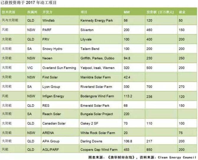 另外,還有15個已獲融資的新能源項目即將動工,包括11個太陽能電廠,3個風電場和1個風能和太陽能混合電廠,單個項目投資額最高達8.5億澳元。