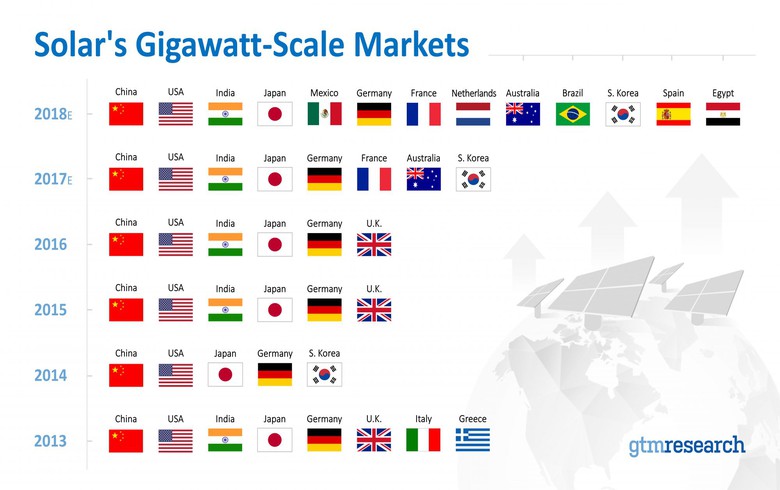 根據(jù)市場調(diào)研機構(gòu)GTM Research,2018年巴西、埃及、墨西哥、荷蘭和西班牙將加入吉瓦級規(guī)模太陽能市場。
