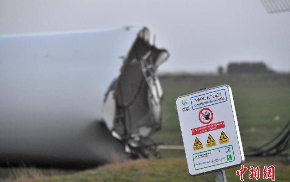 法國(guó)內(nèi)政部建議受風(fēng)暴影響地區(qū)的人員盡量減少出行,如果必須出行應(yīng)盡量降低車速,并注意不要觸碰掉落在地的電線。圖為當(dāng)?shù)孛癖妵^被吹斷的風(fēng)力發(fā)電機(jī)。