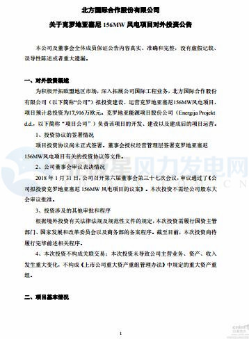 北方國際近日稱,公司擬投資建設、運營克羅地亞塞尼156MW風電項目,項目總裝機容量為 156MW,主要設備包括 39 臺4MW 風機,預計總投資