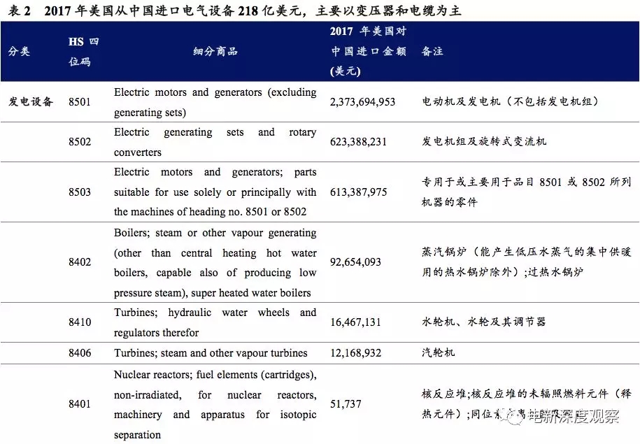 美國2017年從中國進口電氣設備218億美元,主要以變壓器和電纜為主。電氣設備主要集中在85與84HS二位碼目錄下,我們對這兩個目錄的四位碼進行進一步梳理,并剔除其他行業(yè)商品,美國2017年從中國進口電氣設備218億美元,其中,輸變電設備占比73%(主要是變壓器和電纜103億美元),2017年美國從中國進口輸變電設備金額為159億美元;發(fā)電設備占比17%(主要是發(fā)電機和電動機),2017年美國從中國進口發(fā)電設備金額為37.3億美元;蓄電池占比10%,2017年美國從中國進口蓄電池金額為21.4億美元。
