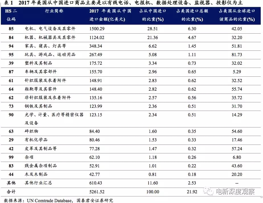 美國從中國進口商品主要以有線電話、電報機、數(shù)據處理設備、監(jiān)視器、投影儀為主。①據聯(lián)合國商品貿易統(tǒng)計數(shù)據庫(由聯(lián)合國統(tǒng)計署創(chuàng)建,是目前全球最大、最權威的國際商品貿易數(shù)據型資源庫),2017年美國從中國進口金額超過5000億美元商品,其中電氣設備和機械設備占比約50%;②但聯(lián)合國統(tǒng)計署對電氣設備與機械設備的行業(yè)劃分包含通信、電子、汽車等等制造業(yè),與A股行業(yè)劃分差異較大,我們對85和84二位碼目錄下的四位碼目錄進一步梳理發(fā)現(xiàn)主要是以有線電話、電報機、數(shù)據處理設備、監(jiān)視器、投影儀為主(見附錄表)。