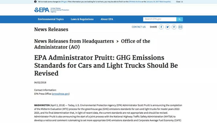 4月2日,美國環(huán)境保護局長斯科特·普魯伊特發(fā)表聲明稱,奧巴馬政府時期制定的汽車油耗標(biāo)準(zhǔn)過高,美國環(huán)境保護局(EPA)將和美國國家公路交通安全管理局(NHTSA)聯(lián)手制定新標(biāo)準(zhǔn)。