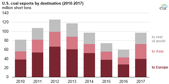 盡管歐洲繼續(xù)成為美國煤炭出口的最大受益國,但對亞洲出口從2016年的1570萬短噸增至2017年的3280萬短噸,增加了一倍多。