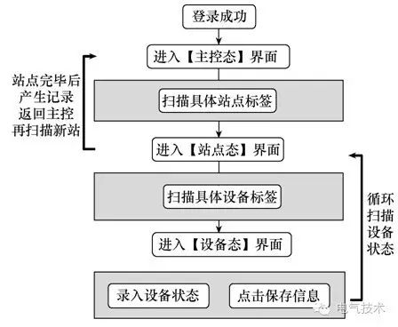 2)主控管理。掃描單元,掃描站點(diǎn)二維碼可出現(xiàn)該站點(diǎn)巡視項(xiàng)目和巡視要點(diǎn),掃描設(shè)備二維碼后能錄入設(shè)備狀態(tài)信息。任務(wù)管理,顯示當(dāng)前站點(diǎn)巡視項(xiàng)目清單和狀態(tài),可直接上下選擇巡視項(xiàng)目,跳入掃描模塊錄入設(shè)備信息(設(shè)備ID由二維碼進(jìn)行讀取,可手動輸入設(shè)備ID值)。運(yùn)維人員通過點(diǎn)選操作手持機(jī),結(jié)合少量手寫描述操作,進(jìn)行運(yùn)行設(shè)備的巡視,以及各種運(yùn)行參數(shù)的記錄,運(yùn)行設(shè)備狀態(tài)及設(shè)備缺陷的記錄。如異常中斷繼續(xù)巡視,需讀取TMP文件的信息記錄,保證跳過已檢設(shè)備。圖6為主控管理流程。