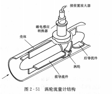 渦輪流量計(jì)結(jié)構(gòu)如圖2-51所示。流體流過(guò)渦輪流量計(jì)時(shí),先經(jīng)過(guò)前導(dǎo)流件,再推動(dòng)鐵磁材料制成的渦輪旋轉(zhuǎn)。旋轉(zhuǎn)的渦輪切割殼體上的磁電感應(yīng)轉(zhuǎn)換器的磁力線,磁路中的磁阻便發(fā)生周期性地變化,從而感應(yīng)出交流電信號(hào)。信號(hào)的頻率與被測(cè)流體的體積流量成正比。渦輪流量計(jì)的輸出信號(hào)經(jīng)前置放大器放大后輸至顯示儀表,進(jìn)行流量指示和計(jì)算。渦輪轉(zhuǎn)速信號(hào)還可用光電效應(yīng)、霍耳效應(yīng)等轉(zhuǎn)換器檢出。渦輪流量計(jì)可精確地測(cè)量潔凈的液體和氣體。