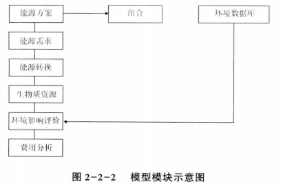1)能源方案主體模塊及其功能:能源方案主體模塊由能源需求、能源轉(zhuǎn)換、生物資源、環(huán)境影響預(yù)測(cè)、費(fèi)用分析等五部分組成。