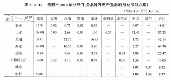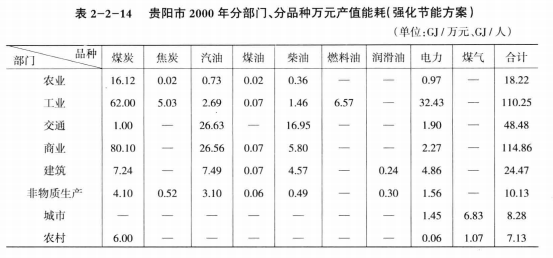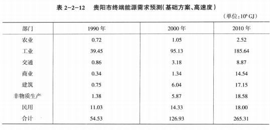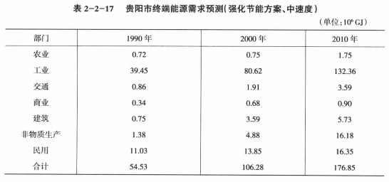 強化節(jié)能方案、中速度終端能源需求預(yù)測結(jié)果,請見表2-2-17貴陽市終端能源需求預(yù)測(強化節(jié)能方案、中速度)。從預(yù)測結(jié)果看出,到2000年終端能源需求達到1.06億GJ、到2010年達到1.77億GJ。與基礎(chǔ)方案相比,到2000年減少能源總需求1 013萬GJ,到2010年減少4 523萬GJ,相當于分別降低煤炭消費量48萬t與216萬t。