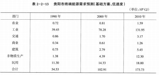 基礎(chǔ)方案、低速度終端能源需求預(yù)測是設(shè)置貴陽市未來GDP產(chǎn)值增長以較低速度增長而得到的預(yù)測結(jié)果。1990-2000年GDP年均增長率為10%、2000-2010年為8.5%,分別比中速度經(jīng)濟發(fā)展低1.74個百分點與1.1個百分點。經(jīng)濟發(fā)展速度低,所需要的能源需求也較低。到2000年終端能源需求達到1.03億GJ、到2010年達到1.73億GJ,分別比中速度經(jīng)濟發(fā)展低1 351萬GJ與3 834萬GJ?;A(chǔ)方案、低速度終端能源需求預(yù)測結(jié)果請見表2-2-13。