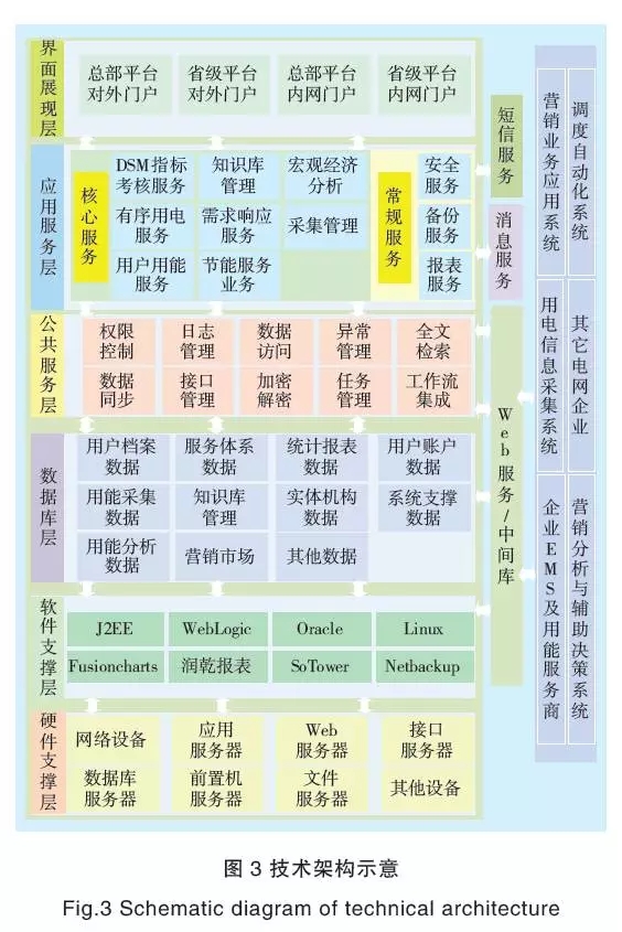電能服務(wù)管理平臺的技術(shù)架構(gòu)如圖3所示,自下而上劃分為硬件支撐層、軟件支撐層、數(shù)據(jù)庫層、公共服務(wù)層、應(yīng)用服務(wù)層、界面展示層。