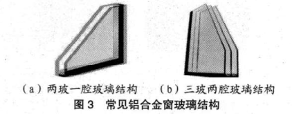 為滿足鋁合金密保溫性能要求,國內(nèi)鋁合金窗玻璃結(jié)構(gòu)一般為兩玻一腔或三玻兩腔結(jié)構(gòu),如圖3所示。兩種玻璃結(jié)構(gòu)的主要區(qū)別在于三玻兩腔的玻璃結(jié)構(gòu)具有更好的隔音和保溫性能。