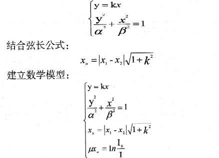 當(dāng)橢圓與標(biāo)準(zhǔn)圓在X光照方向上沒有發(fā)生疊加時(shí),穿過標(biāo)準(zhǔn)圓形心的光線接收信息達(dá)到最大值。分析橢圓的特性日J(rèn)‘知,當(dāng)一組平行線照射橢圓時(shí),穿過形心的宣線所截得的弦K最大,與形心距離等長(zhǎng)的兩條平行線所截得的弦長(zhǎng)長(zhǎng)度相等。設(shè)通過坐標(biāo)原點(diǎn)(0,0)的直線與橢圓的兩個(gè)交點(diǎn)坐標(biāo)分別(x1、y2)、(x2、y2),可以建如下方程組: