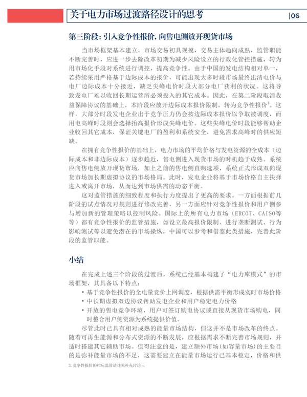 建立電力市場是復(fù)雜的系統(tǒng)性工作。盡管有相關(guān)國際經(jīng)驗可以借鑒,中國要在較短時間內(nèi)實現(xiàn)從政府計劃向現(xiàn)貨市場的轉(zhuǎn)變,仍面臨著來自規(guī)則設(shè)計和平衡相關(guān)方利益方面的較大挑戰(zhàn)。在此背景下,本報告結(jié)合各國電力市場改革經(jīng)驗,探討了電力市場過渡方案的設(shè)計思路,旨在采用分步驟控制風(fēng)險的方法,減少改革初期的難度和阻力,幫助穩(wěn)步建立電力市場。具體設(shè)計思路分三個階段:第一階段,全電量變更為基于成本的經(jīng)濟(jì)調(diào)度,但通過收益保障(金融性)協(xié)議保證發(fā)電企業(yè)收益基本不變;第二階段,擴(kuò)大市場化定價范圍,將收益保障協(xié)議轉(zhuǎn)變?yōu)槭袌鰠f(xié)議,將市場帶來的成本降低紅利逐漸傳導(dǎo)至消費(fèi)側(cè);第三階段,完全放開發(fā)電和用戶參與現(xiàn)貨和中長期市場,采用競爭性報價,充分發(fā)揮市場作用。由于篇幅有限,本報告僅圍繞一種過渡設(shè)計展開,但希望其中探討的各市場元素設(shè)計和原則能夠為目前各省的現(xiàn)貨市場試點設(shè)計工作提供參考。