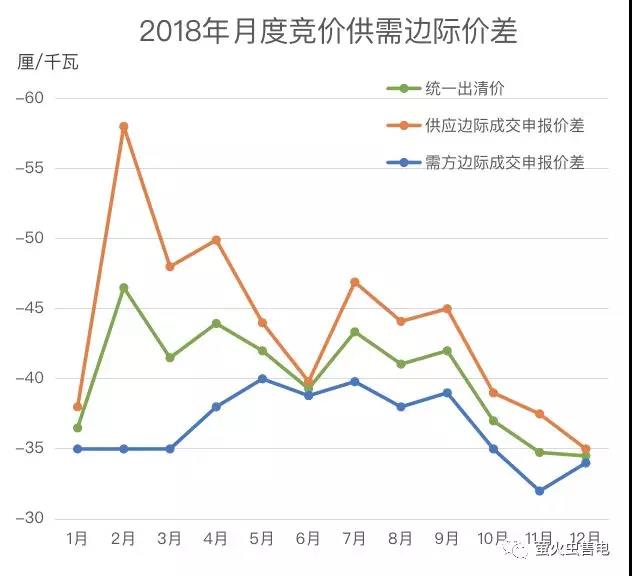 2018年受市場供需比限制,月度競價(jià)價(jià)差起伏不大,2月份最高降幅為-46.5厘/千瓦時(shí),12月份最低降幅僅為-34.5厘/千瓦時(shí)。
