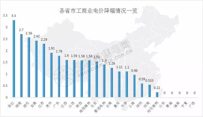 從目前公布降價(jià)的省份來(lái)看,降價(jià)幅度最大的當(dāng)屬浙江省,一般工商業(yè)電價(jià)及輸配電價(jià)均降幅3.3分,緊隨其后的為剛剛公布的湖南省,降價(jià)幅度為2.7分,第三是最早公布降電價(jià)方案的湖北省,降幅2.56分。