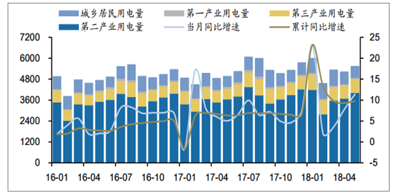 2018年1-5月 全社會用電量累計26628億千瓦時 同比增長9.7%