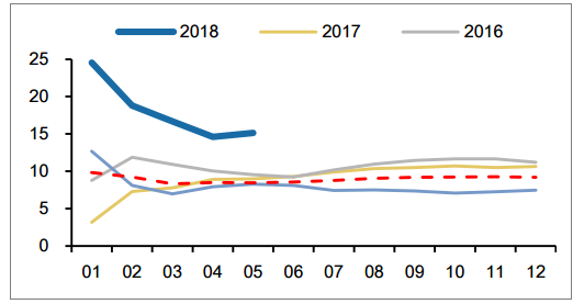 2018年1-5月,第二產(chǎn)業(yè)用電增速為7.7%(13-17年間平均增速為3.1%),增速較去年同期 增長1.4個百分點(diǎn),對增速的貢獻(xiàn)率為49.3 %(13-17年間平均貢獻(xiàn)率為41.6%), 貢獻(xiàn)率較去年同期下降20.7個百分點(diǎn)。其中,5月當(dāng)月用電增速為10.9%(13-17年 間平均增速為2.9%),用電環(huán)比增速為9 %(13-17年間平均增速為5.5%)。