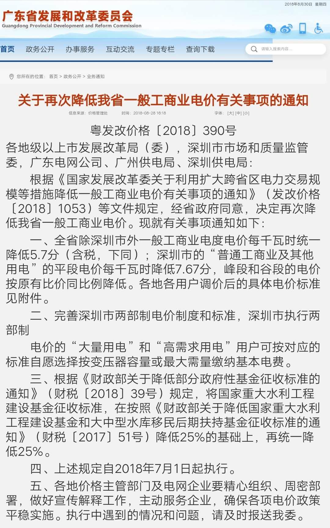 8月28日,廣東省發(fā)改委官網(wǎng)公布的《關(guān)于再次降低我省一般工商業(yè)電價有關(guān)事項的通知》顯示,廣東全省除深圳市外一般工商業(yè)電度電價每千瓦時統(tǒng)一降低5.7分(其中,深圳市的“普通工商業(yè)及其他用電”的平段電價每千瓦時降低7.67分,峰段和谷段的電價按原有比價同比例降低。)。廣東此次降電價的決定,是根據(jù)《國家發(fā)展改革委關(guān)于利用擴大跨省區(qū)電力交易規(guī)模等措施降低一般工商業(yè)電價有關(guān)事項的通知》(發(fā)改價格〔2018〕1053)等文件規(guī)定作出的。