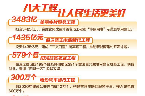 ──保衛(wèi)藍(lán)天電能替代工程。主要安排清潔能源消納和電能替代2項舉措,投資1435億元,建成“三交四直”特高壓工程,推動西南水電和西部、北部新能源集約開發(fā)外送,每年在發(fā)電側(cè)消納清潔能源2.2萬億千瓦時;2018~2020年在消費側(cè)以電代煤、代油5800億千瓦時,減排二氧化碳等污染物7.6億噸。