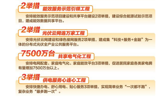 ──共享電氣化工程。主要安排電網(wǎng)配套、家庭電氣化、家庭能效平臺3項舉措,與家電廠商、電動汽車廠商、電采暖設(shè)備供應(yīng)商深度合作,提供平價家電、智能家居、電采暖、電動汽車等一攬子服務(wù),促進(jìn)居民家庭各類家電擁有量增加7500萬臺以上。
