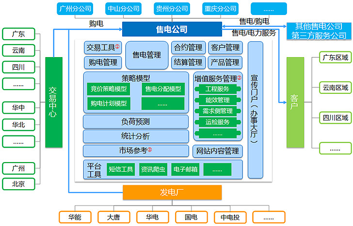 可實現(xiàn)電力購售電業(yè)務(wù)開展、電力交易決策輔助分析、客戶自助服務(wù)平臺、售電業(yè)務(wù)基礎(chǔ)數(shù)據(jù)采集等功能。