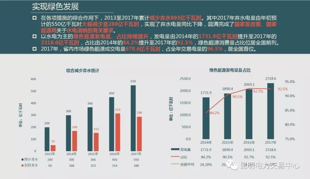 通過(guò)電力市場(chǎng)化改革,有力促進(jìn)了富余水電的消納。特別是2017 年以來(lái),云南水電消納得到國(guó)務(wù)院領(lǐng)導(dǎo)的高度重視,國(guó)家發(fā)改委、國(guó)家能源局和中國(guó)南方電網(wǎng)公司先后出臺(tái)10 條、20 條措施促進(jìn)水電消納,2017 年云南水電在來(lái)水大幅好于預(yù)期的形勢(shì)下,實(shí)現(xiàn)“一升一降”,即水能利用率同比提升2.4個(gè)百分點(diǎn),棄水電量同比減少25.3 億千瓦時(shí)。