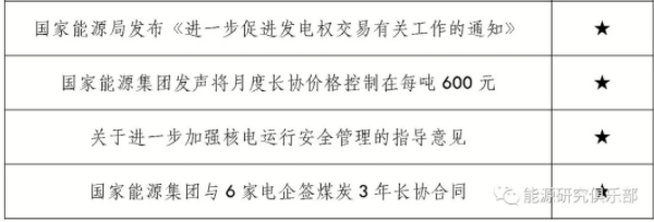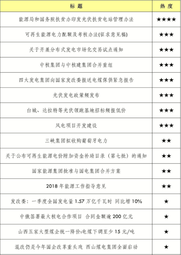 在榜單中,煤電消息上榜4條,主要集中在保供和穩(wěn)定電煤價格方面。煤電在我國能源結(jié)構(gòu)中占比較高,一直受到行業(yè)和媒體關注。2018年1月,“四大發(fā)電集團向國家發(fā)改委報送電煤保供緊急報告”稱,電煤保供形勢嚴峻,煤價不斷上漲,火電板塊陷入全面虧損,希望增加煤炭供應,終止部分鐵路局煤炭運費漲價,盡快調(diào)控降低煤價。年初,國家能源集團與大唐、國投、浙能、粵電、江蘇國信、上海申能六大電力企業(yè)簽訂3年期電煤中長期合同,首次將中長期合同周期從1年延長到3年。煤電矛盾由來已久,煤炭占據(jù)發(fā)電企業(yè)60%的成本,煤炭價格高企對于發(fā)電企業(yè)來說是沉重的負擔。煤電行業(yè)在尋找各種途徑降低煤價,緩解煤電矛盾。
