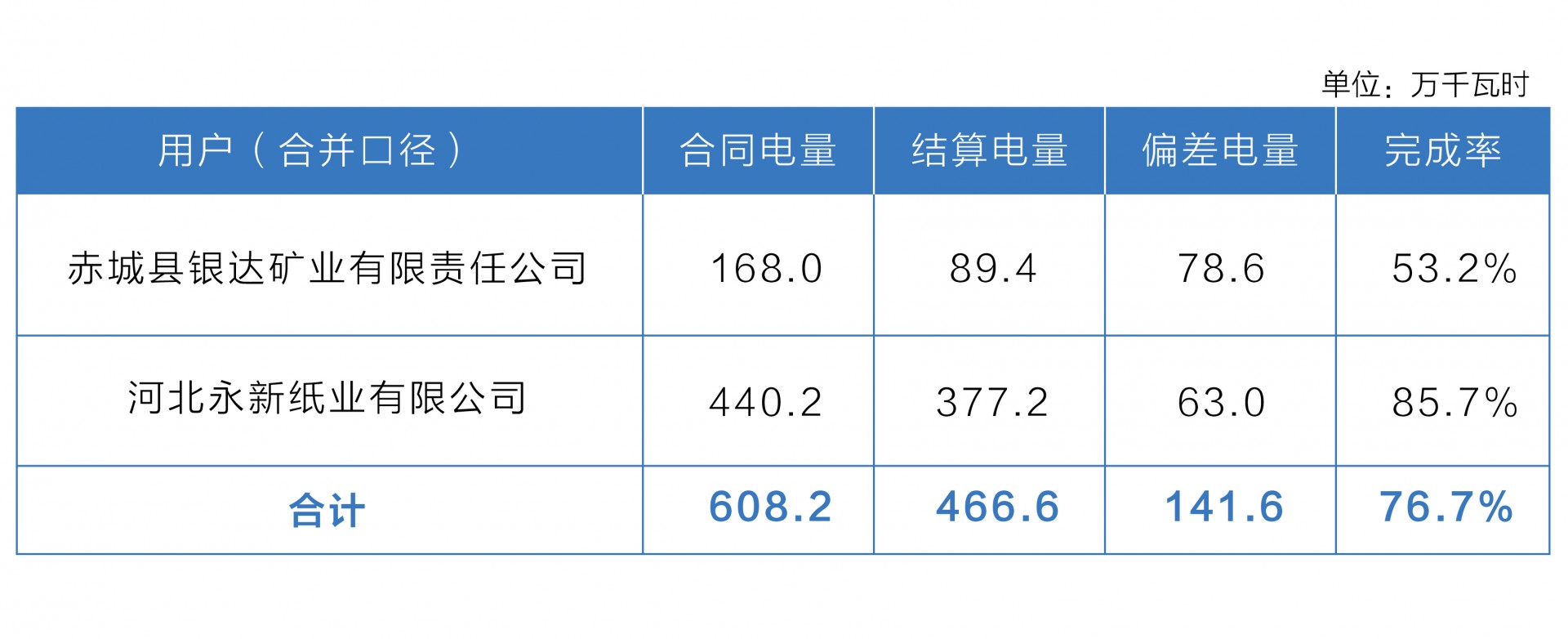 本次用戶與發(fā)電廠共達成直接交易結果171筆,電量5.17億千瓦時,實際結算電量5.15億千瓦時,完成率99.7%。偏差電量超過5%的電力用戶情況如下:
