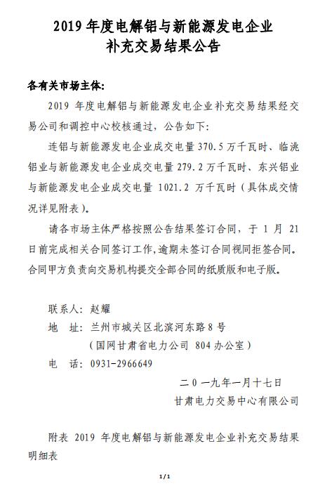 甘肅電力交易中心發(fā)布了《2019年電解鋁補(bǔ)充交易結(jié)果公告》