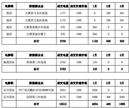 甘肅電力交易中心日前發(fā)布了《2019年電解鋁補(bǔ)充交易結(jié)果公告》,連鋁與新能源發(fā)電企業(yè)成交電量370.5萬(wàn)千瓦時(shí)、臨洮鋁業(yè)與新能源發(fā)電企業(yè)成交電量279.2萬(wàn)千瓦時(shí)、東興鋁業(yè)與新能源發(fā)電企業(yè)成交電量1021.2萬(wàn)千瓦時(shí)。