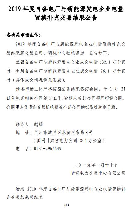 甘肅電力交易中心發(fā)布了《2019年度自備電廠電量置換補(bǔ)充交易結(jié)果公告》