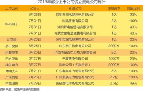 目前很多上市公司已成立了售電公司,積極進行售電側(cè)的市場布局,如科陸電子、比亞迪、孚日股份、四方股份等民營上市公司積極運用社會資本投資成立售電公司;而內(nèi)蒙華電、桂東電力、粵電力、廣州發(fā)展、申能股份、漳澤電力等發(fā)電公司也都相繼成立了自己的售電公司。